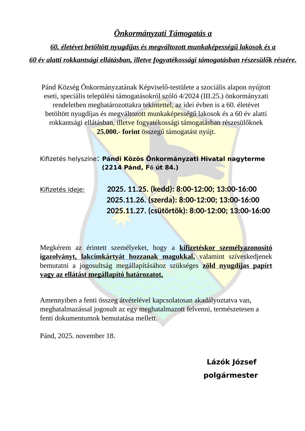 Önkormányzati támogatás a 60.életévet betöltött nyugdíjas és megváltozott munkaképességű lakosok és a 60 év alatti rokkantsági ellátásban, illetve fogyatékossági támogatásban részesülők részére