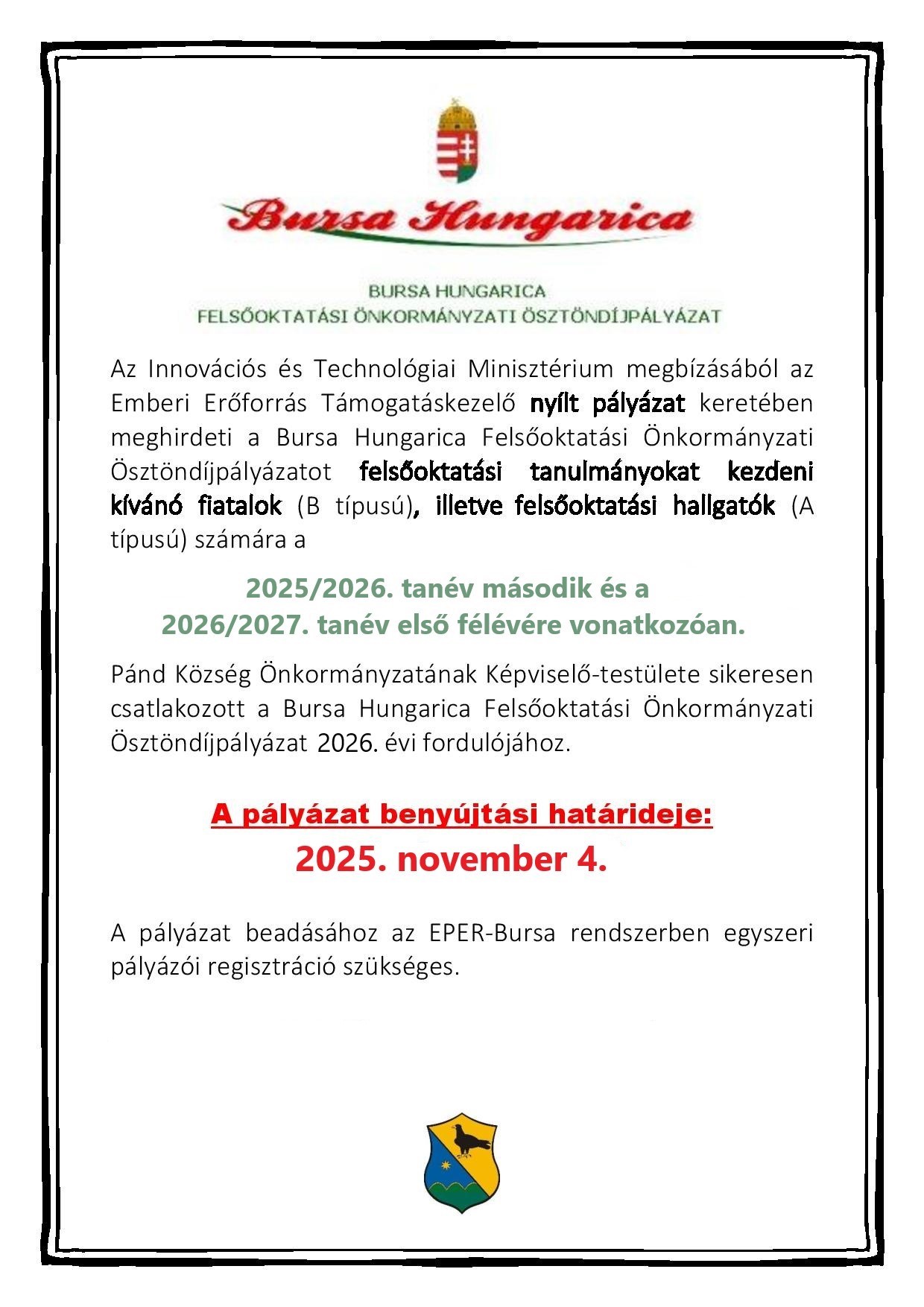 Eper-Bursa belépési pontok: https://emet.gov.hu/eper-bursa-belepesi-pontok/ Csatolmány(ok): A típusú pályázat kiírás 189.61 KB A típusú pályázati űrlap minta339.02 KB B típusú pályázati kiírás212.38 KB B típusú pályázati űrlap minta361.15 KB Bursa Hungarica pályázat kiírás - 2026. év