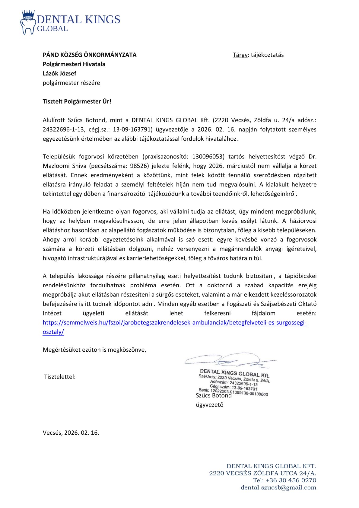 Tájékoztató fogorvosi ellátással kapcsolatban